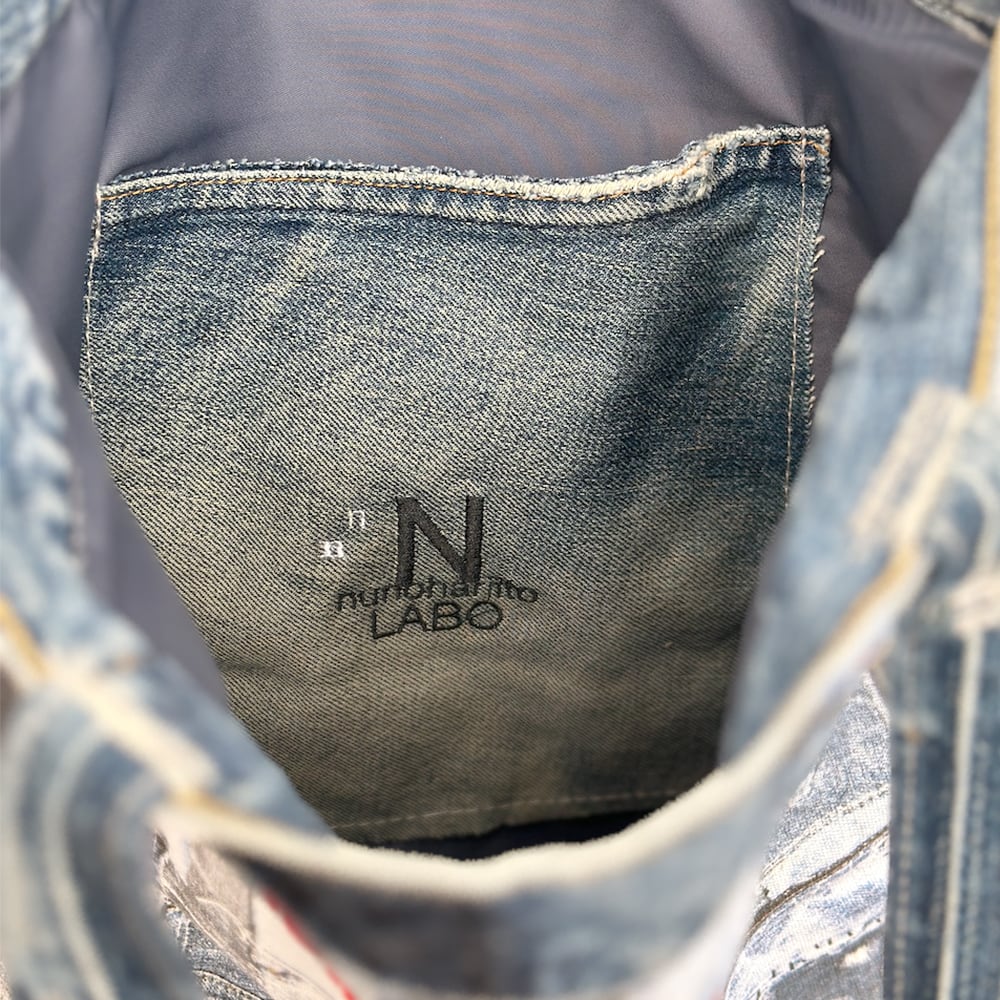 *素材にユーズドデニムを使用していますのでデニムの色あいには個体差があります。