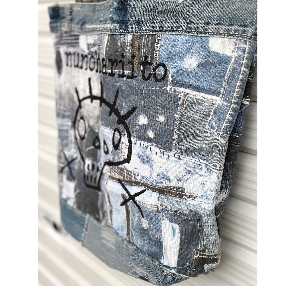 個性的なデニムパッチワークに、刺繍で描いたスカルの絵柄がポップなトートバッグ。